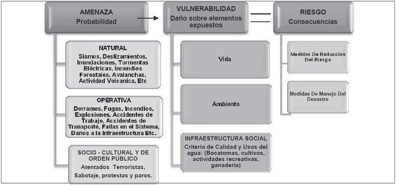 – Escenario de riesgo: Un escenario de riesgo corresponde a un análisis presentado en forma escrita, cartográfica o diagramada, utilizando técnicas cuantitativas y cualitativas, de las dimensiones del riesgo que afecta o puede afectar al sistema de Gestión del Vertimiento. Significa una consideración pormenorizada de las amenazas y la vulnerabilidad, y como metodología ofrece una base para la toma de decisiones sobre la intervención.