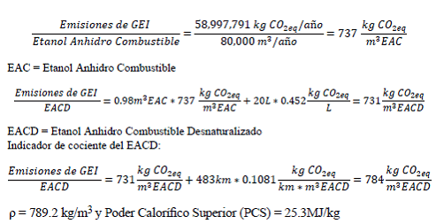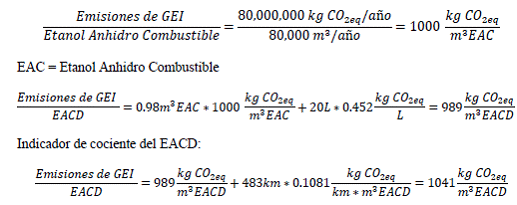 | Criterio | Emisión (kg de CO2 equivalente / m3 Etanol Anhidro Combustible Desnaturalizado) |