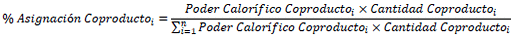 PASO 2: Asignar un porcentaje de las emisiones reportadas en los tres alcances para las etapas del proceso productivo a cada uno de los coproductos, sin incluir la gestión energética del proceso industrial, teniendo como criterio de asignación la distribución energética entre el etanol y los coproductos principales que se comercialicen y apliquen para cada proceso. La asignación energética se realiza teniendo en cuenta la energía contenida en cada uno de los coproductos, es decir el resultado de la multiplicación del poder calorífico y la cantidad producida del coproducto en el periodo de tiempo establecido. El porcentaje de asignación en los procesos comunes a cada coproducto debe calcularse de la siguiente forma, donde n representa el número total de coproductos incluyendo el Etanol Anhidro Combustible Desnaturalizado: