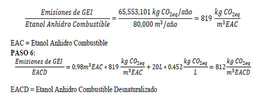 PASO 5: Sumar las emisiones de las etapas del proceso productivo para la producción de Etanol Anhidro Combustible Desnaturalizado calculadas en el paso 2 y el paso 4 y dividirlas por los metros cúbicos de Etanol Anhidro Combustible Desnaturalizado producido en el periodo de tiempo donde se calcularon estas emisiones.