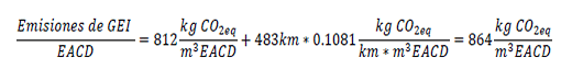 PASO 7: Estimar las emisiones asociadas con el transporte desde la planta hasta el centro de abasto mayorista en Mansilla, Facatativá. Las emisiones consideradas para el transporte terrestre del EACD son 0.1081 kg CO2e/(km*m3 de EACD)5 y la distancia de la planta ejemplo hasta el centro de mezcla mayorista es de 483 km.