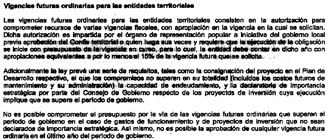 - Concepto 2 del 15 de noviembre de 2006: al pronunciarse sobre la aplicación de la Ley 819 de 2003 en las entidades territoriales, y en especial, respecto de las vigencias futuras, dice lo siguiente: